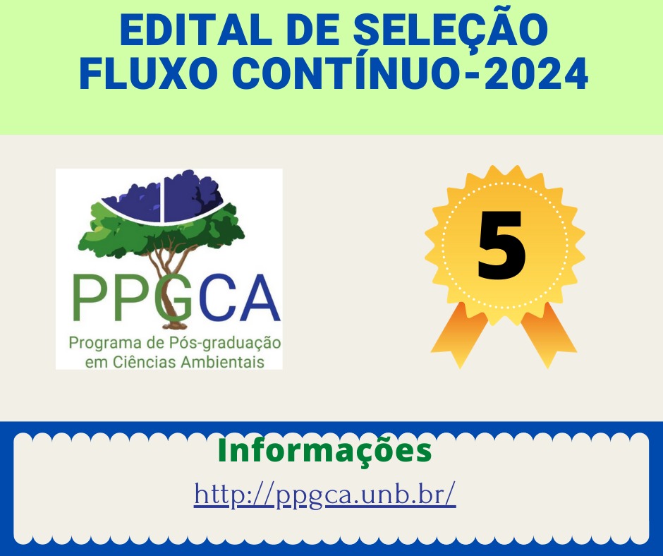 O Coordenador do Programa de Pós-Graduação em Ciências Ambientais, no uso de suas atribuições legais, torna público e estabelece as normas do processo seletivo para o preenchimento de vagas dos cursos de Mestrado Acadêmico e Doutorado do Programa de Pós-Graduação em Ciências Ambientais, em conformidade com as exigências do Regulamento do programa e da Resolução Nº 080/2021 do Conselho de Ensino, Pesquisa e Extensão da UnB, Resolução n° 044/2020 do Conselho de Ensino, Pesquisa e Extensão da UnB, Resolução n° 090/2022 do Conselho de Ensino, Pesquisa e Extensão da UnB, Resolução n° 05/2020 da Câmara de Pesquisa e Pós-Graduação da UnB, Resolução n° 06/2020 da Câmara de Pesquisa e Pós-Graduação da UnB e Instrução Normativa n° 005/2020 do Decanato de Pós-Graduação.